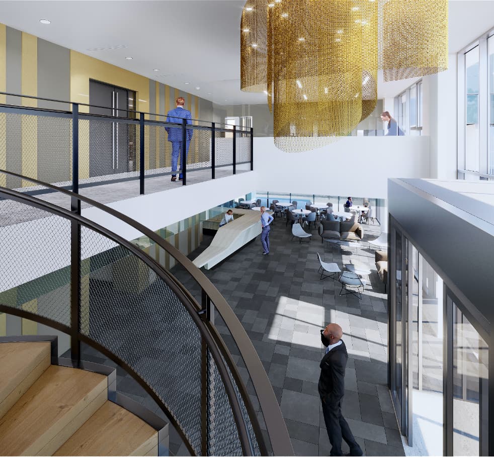 Ouvert et entièrement vitré, le hall d’entrée double hauteur de Bel’air apporte immédiatement une sensation de confort aux utilisateurs et aux visiteurs. Ses 347,50 m2 baignés de lumière naturelle comprennent un accueil, une zone dédiée au coworking et un espace cafétéria convivial.