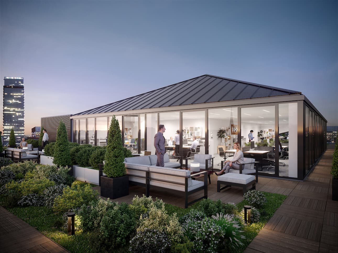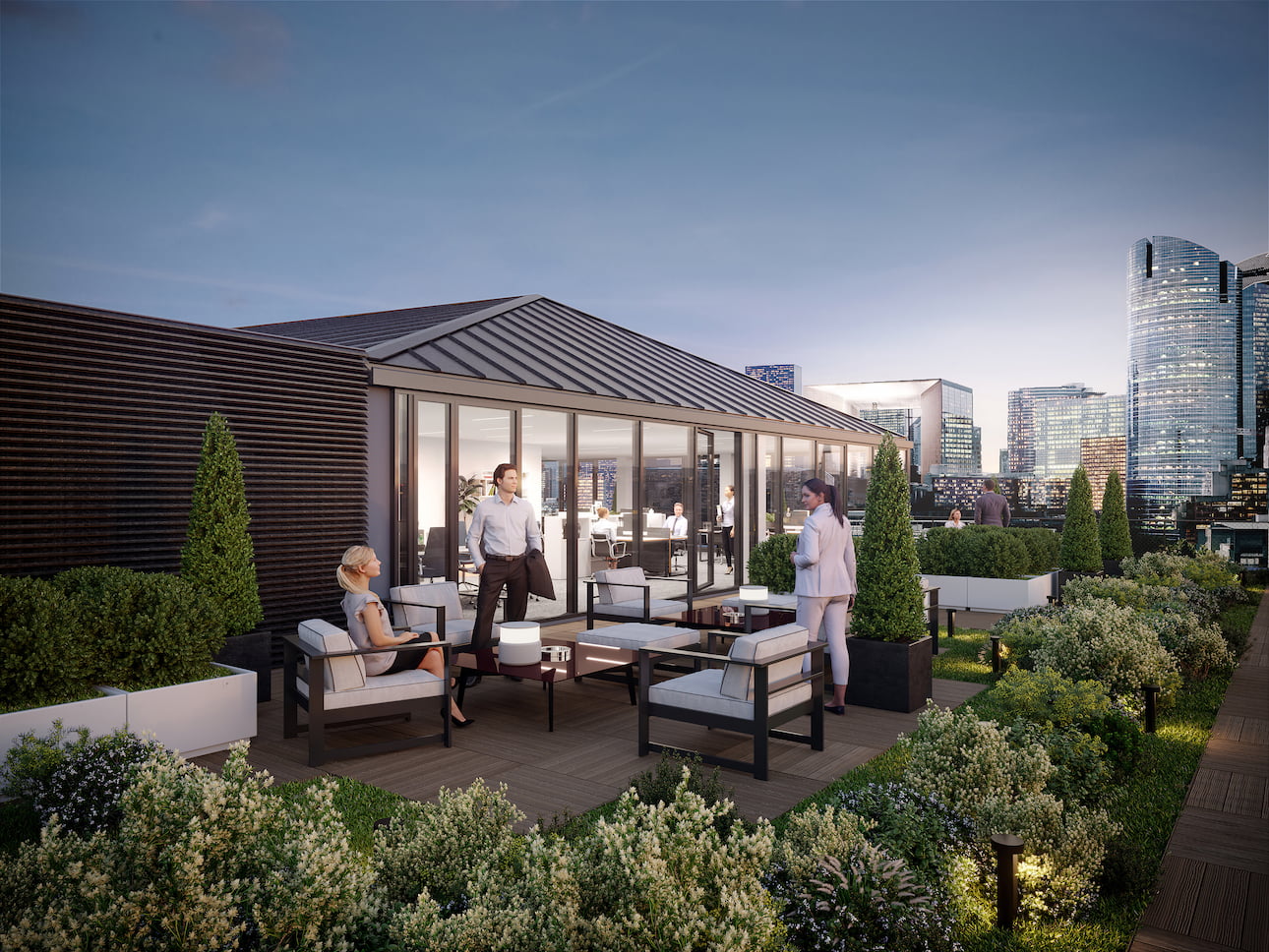 Au dernier étage, Bel’air dispose d’un espace extérieur privatif entièrement dédié à l’impulsion d’une nouvelle façon de travailler. Lieu de réunion et de partage privilégié où échanger de façon plus informelle tout en contemplant la vue imprenable sur La Défense, ce rooftop* d’exception est ponctué de verdure afin de ramener la nature en ville et replacer le bien-être au cœur de l’entreprise.