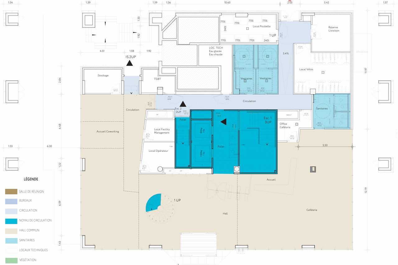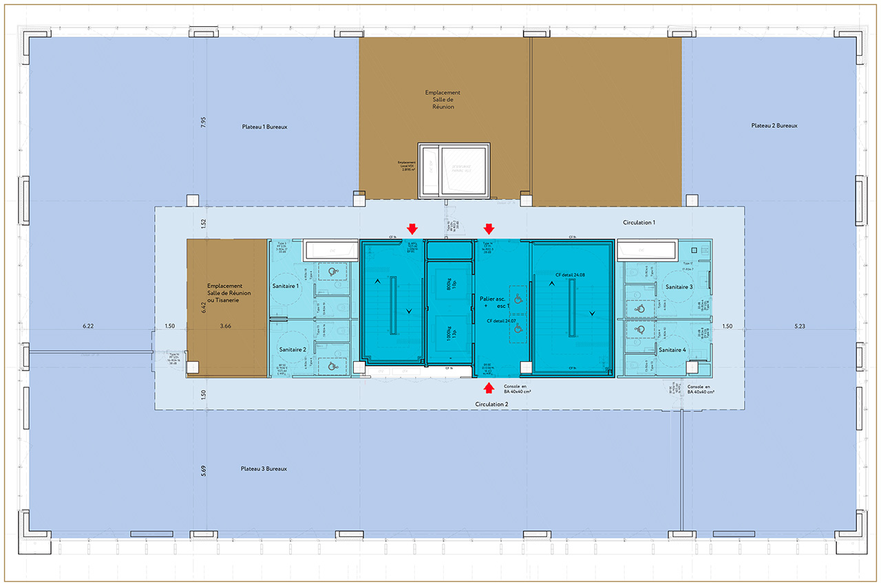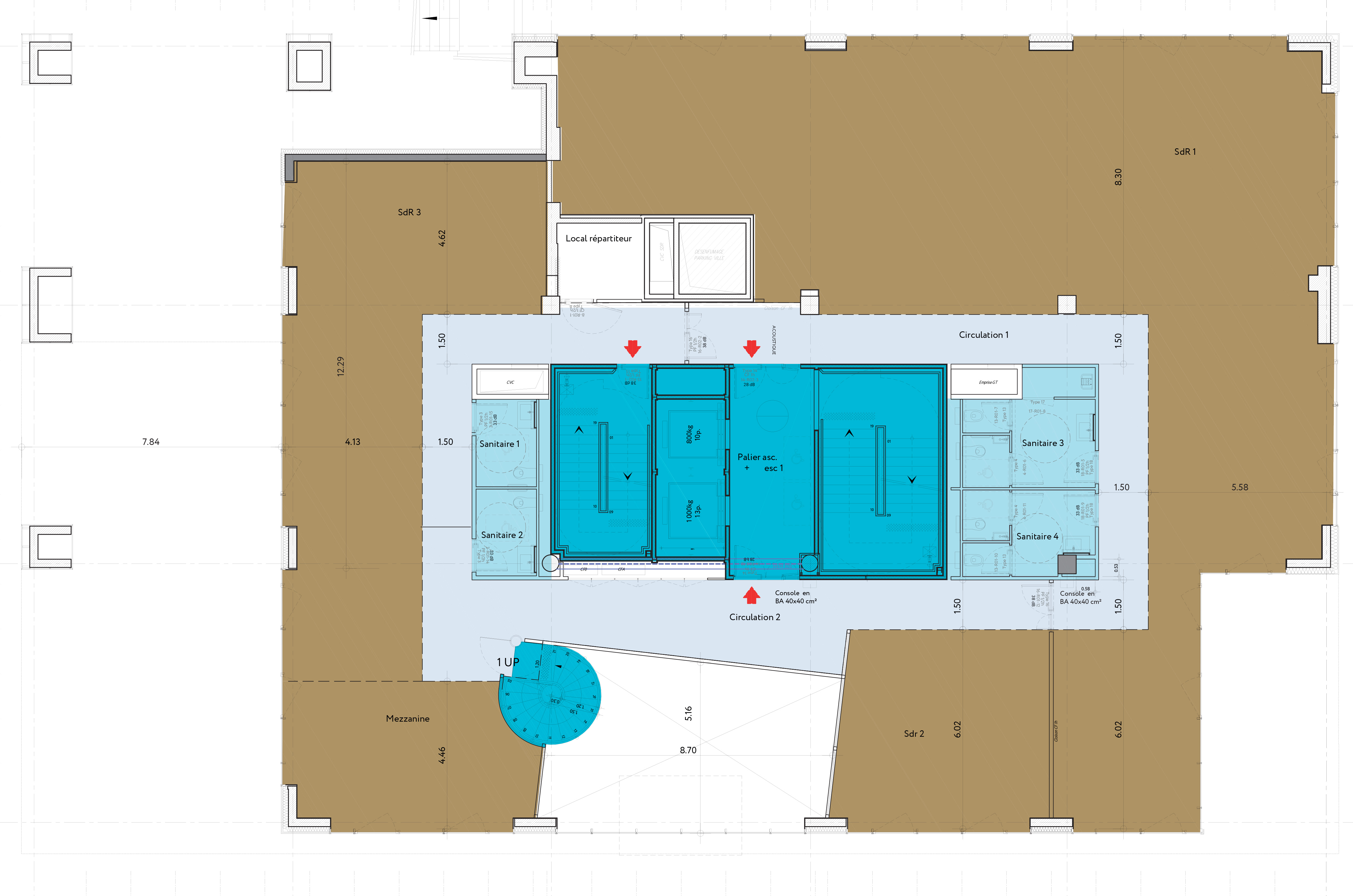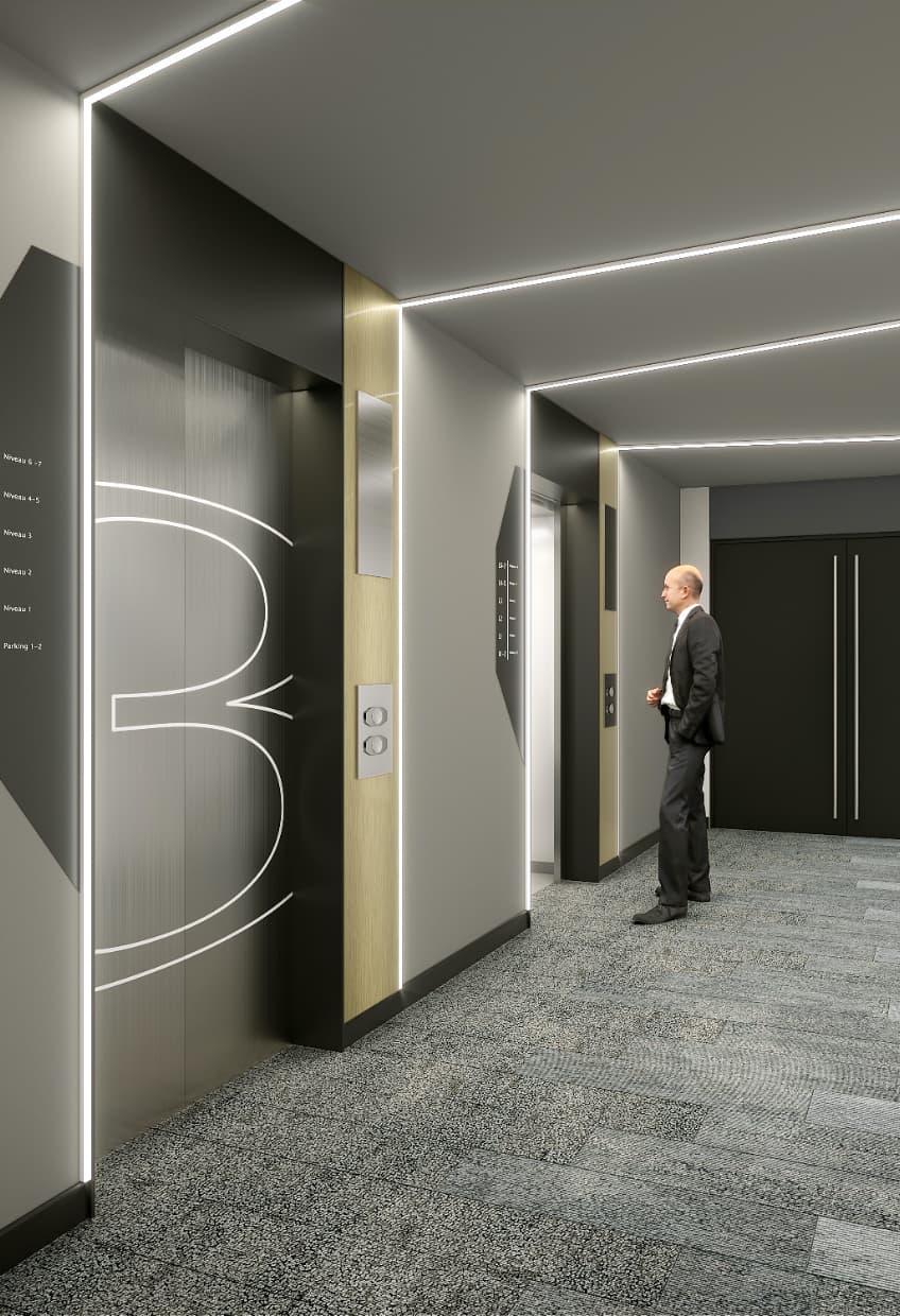 Chaque étage est desservi par une double cage d’escalier et une double cage d’ascenseur pour une circulation optimisée, entièrement adaptée aux personnes à mobilité réduite.